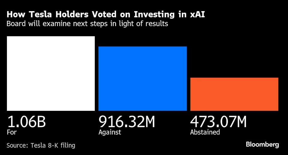 A Tesla Inc. shareholder proposal for the board to authorize an investment in xAI wasn’t approved, clouding prospects for the Elon Musk-led carmaker to take a stake in his artificial intelligence startup.